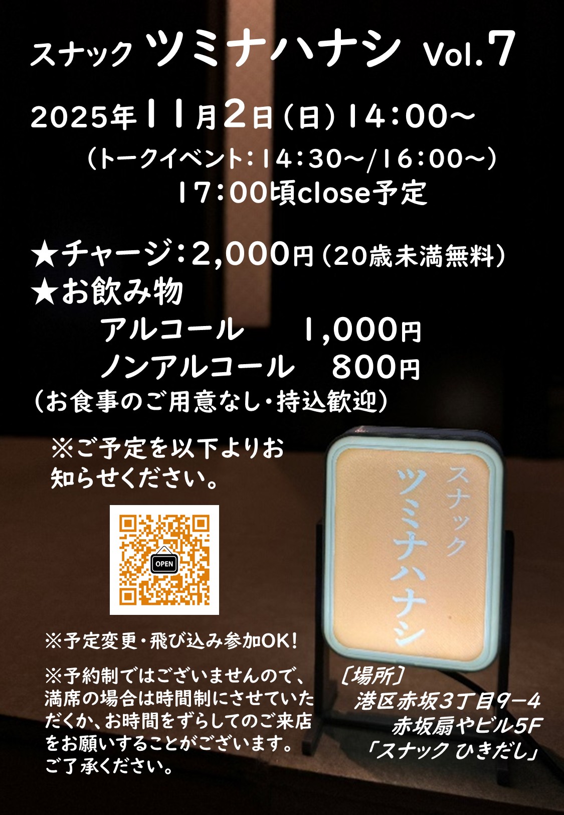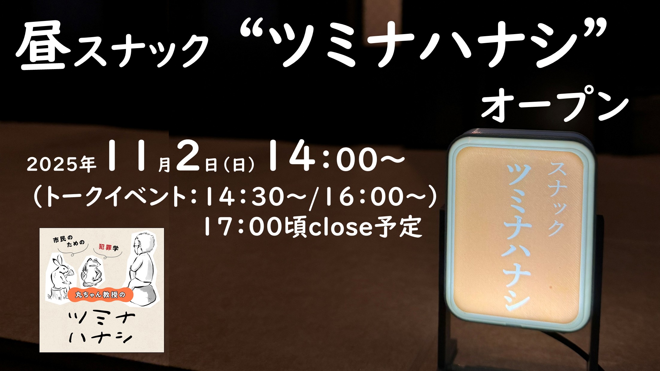 11月2日(日)「スナックツミナハナシ」を開催します。やっと過ごしやすい気候になりました。お出かけ日和にまたもや室内イベントで恐縮ですが、最近の刑事政策・犯罪学まわりのアレコレを語る3時間にできればと思っています。お気軽にお立ち寄りいただければ幸いです。