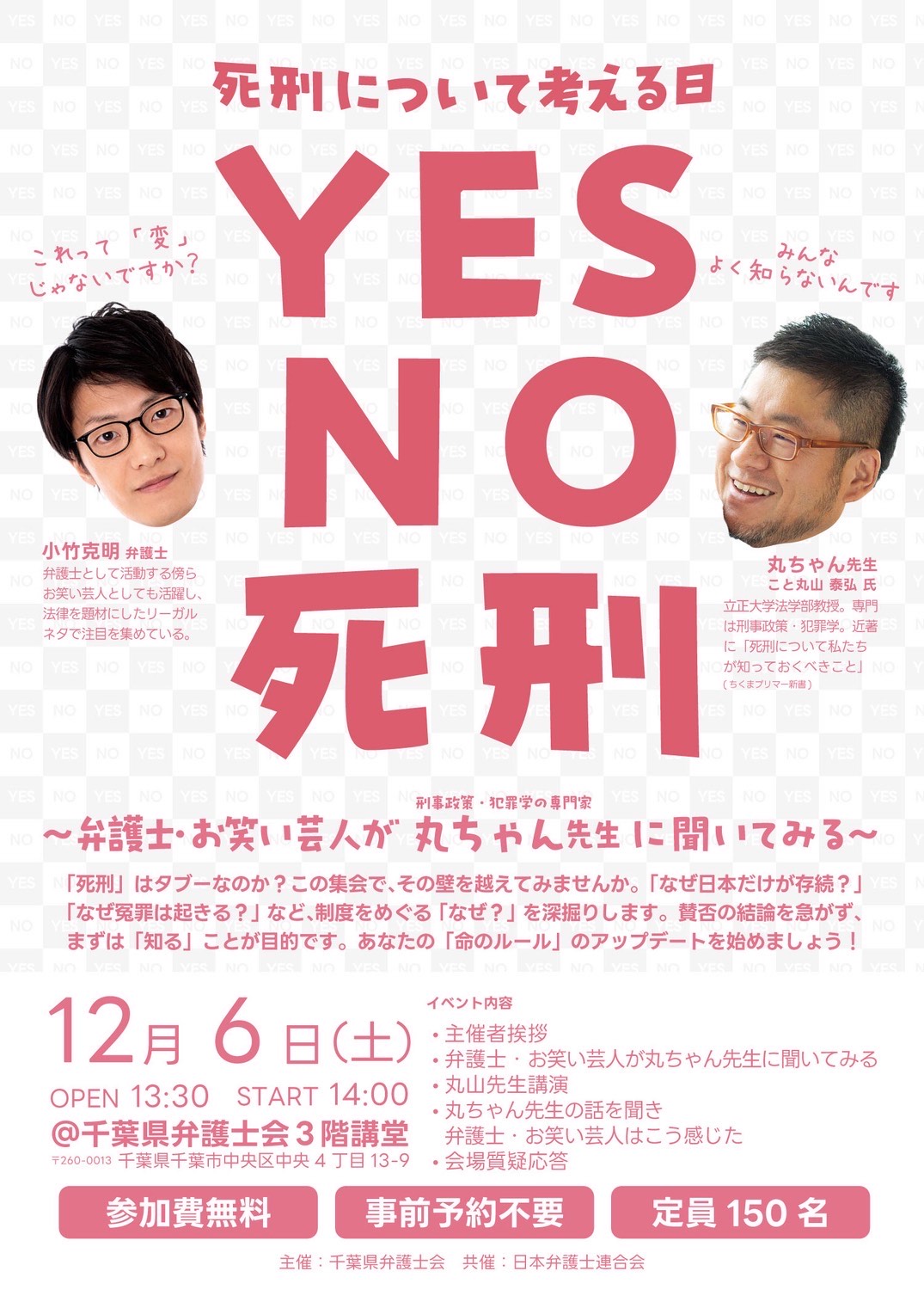 理事の丸山が、弁護士で芸人の小竹克明さんと一緒に千葉県弁護士会で「死刑について考える日:弁護士・お笑い芸人が丸ちゃん先生に聞いてみる」を開催します!