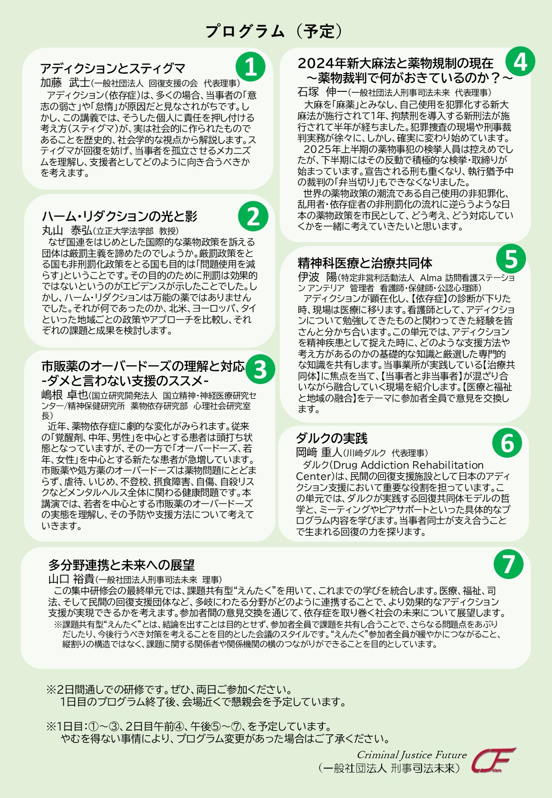 このたび、私たちは久しぶりに、じっくりと“薬物問題の最前線”を学び合う二日間の研修会を企画しました。現場の実践を共有し、制度や支援のあり方をともに考える時間にしたいと思います。