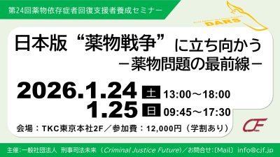 第24回薬物依存症者回復支援者(DARS)養成セミナー 日本版“薬物戦争”に立ち向かう-薬物問題の最前線- 開催のご案内 依存症からの回復を支援しているみなさまへ 大麻使用罪が創設されてから一年が経ちました … 続きを読む 〔開催〕DARS「日本版“薬物戦争” に立ち向かう-薬物問題の最前線-」