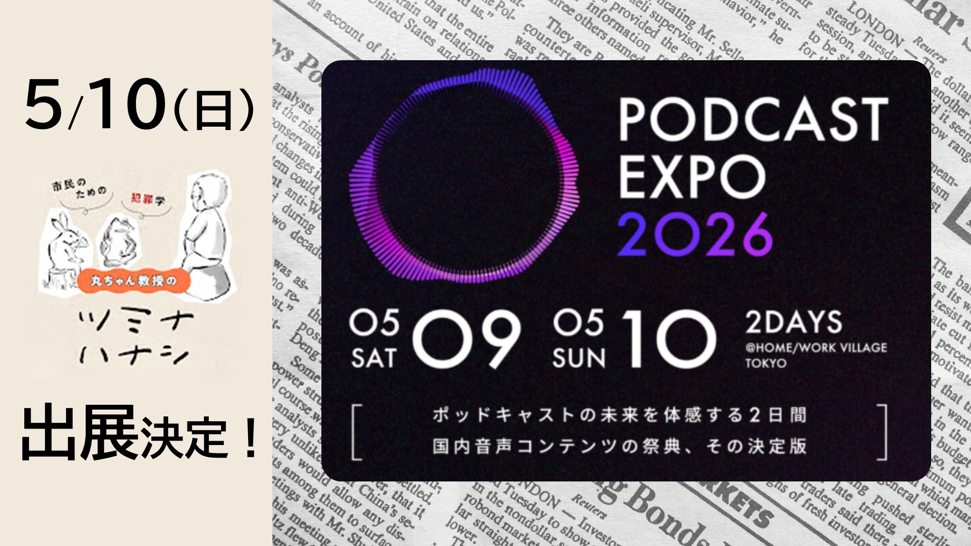国内最大のポッドキャストの祭典「PODCAST EXPO2026」に、「丸ちゃん教授のツミナハナシ」の出展が決定しました! 2026年5月10日(日)、東京・HOME/WORK VILLAGEにて、入場無料です。