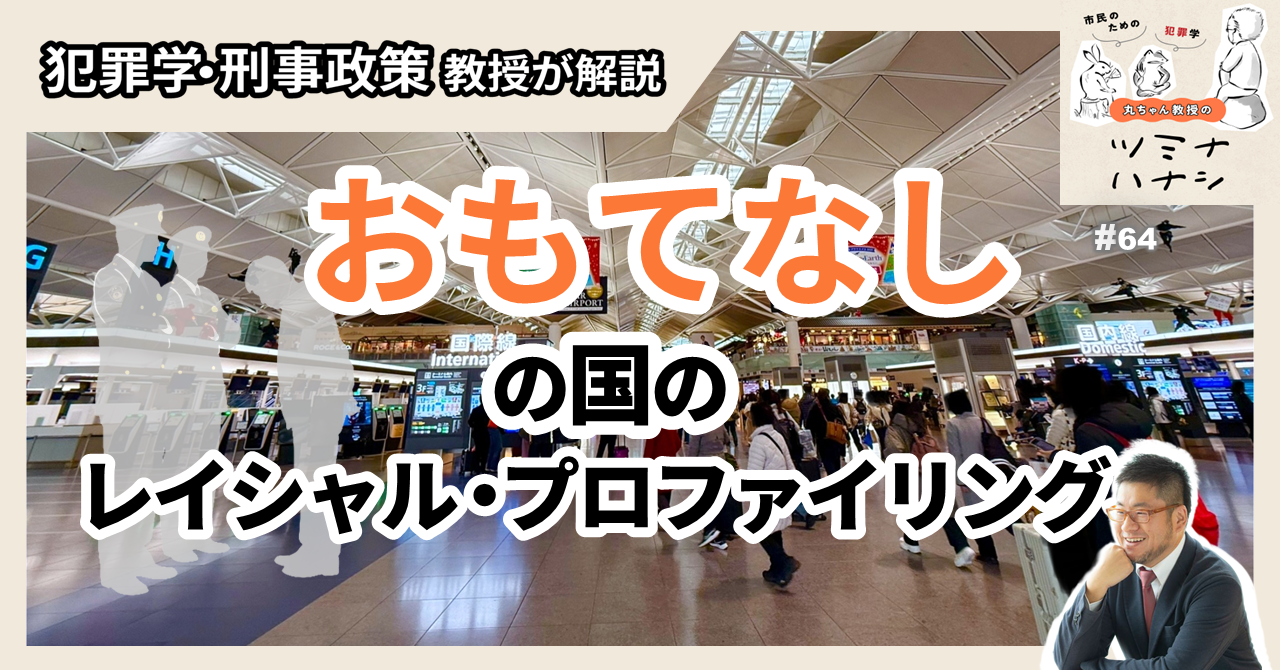 2026年4月14日(火)、「丸ちゃん教授のツミナハナシ―市民のための犯罪学―」#064「“おもてなし” の国のレイシャル・プロファイリング」を配信しました。前回、語り切れなかった「レイシャル・プロファイリング」がテーマです。人種や肌の色、髪の毛などで人をくくって危険視することの意味をともに考えてくださったら、嬉しいです。ぜひお聴きください。